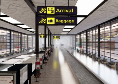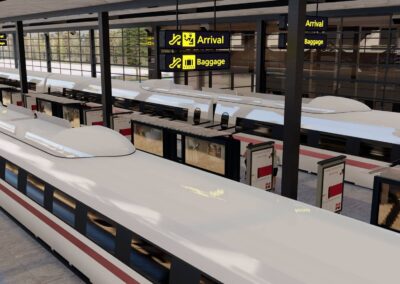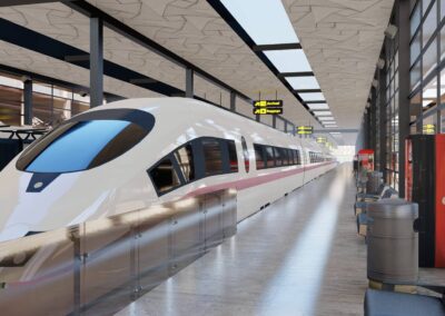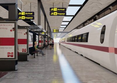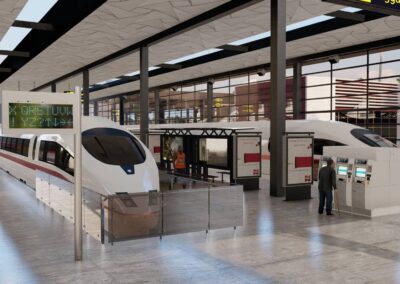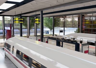 Inside, the station is equipped with multiple levels, each dedicated to different aspects of the passenger experience. The ground level hosts ticketing kiosks and digital information displays that use AI to provide real-time updates on train schedules and routes. Automated gates and facial recognition technology ensure quick and secure access to platforms.