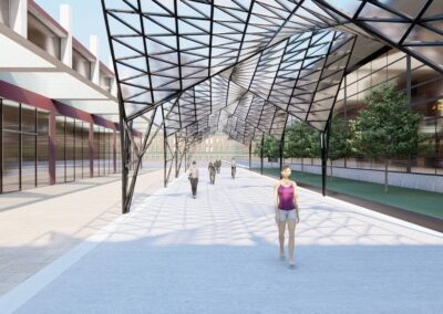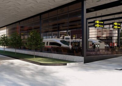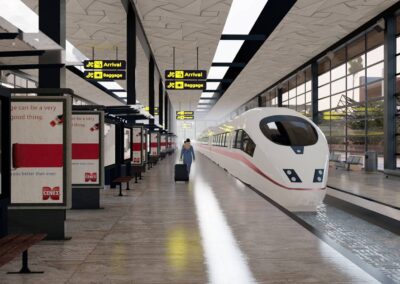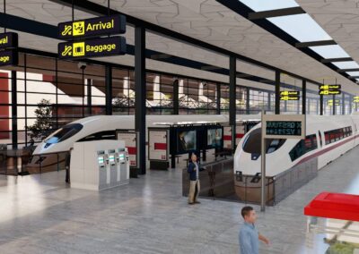 The upper levels feature spacious waiting areas with comfortable seating, retail outlets, cafes, and green spaces that enhance the station’s appeal as a social hub. The platforms themselves are designed with precision, featuring advanced safety systems, including automated barriers and intelligent crowd management solutions.