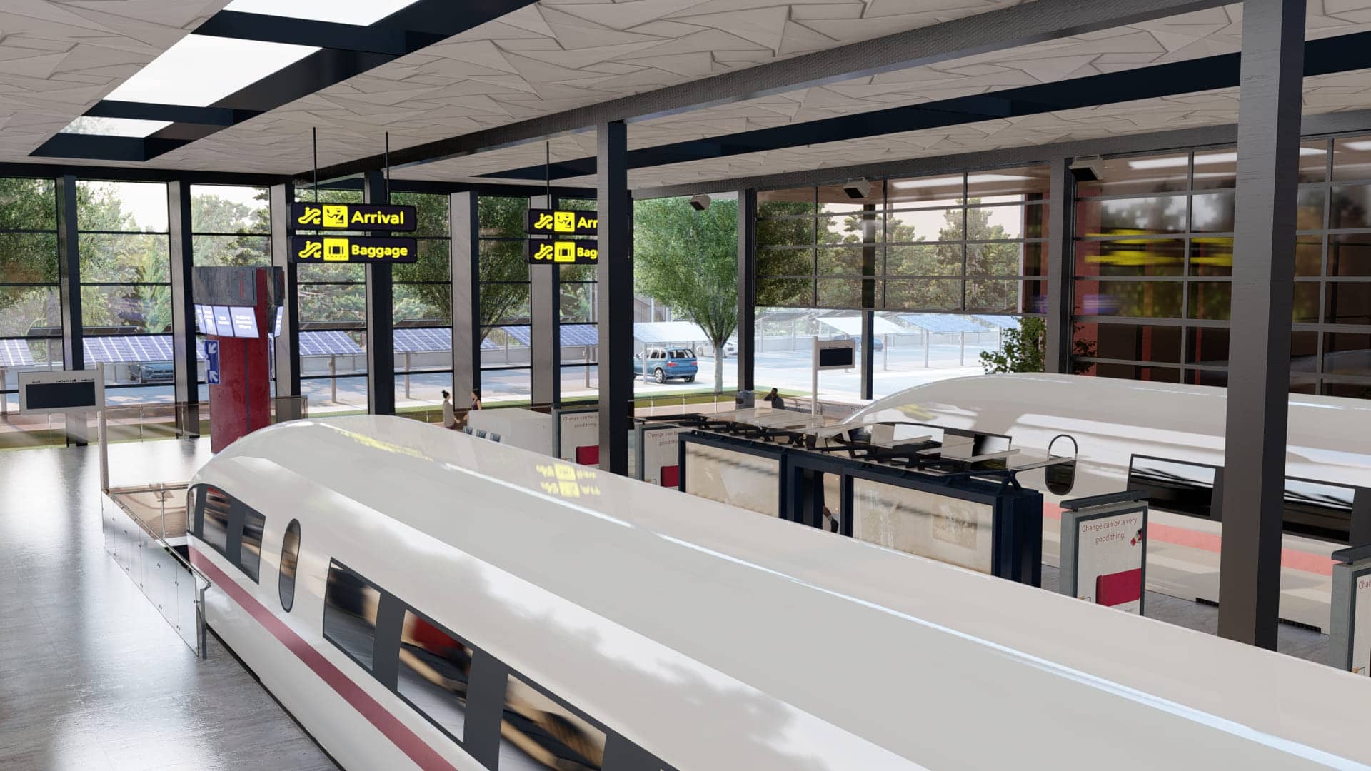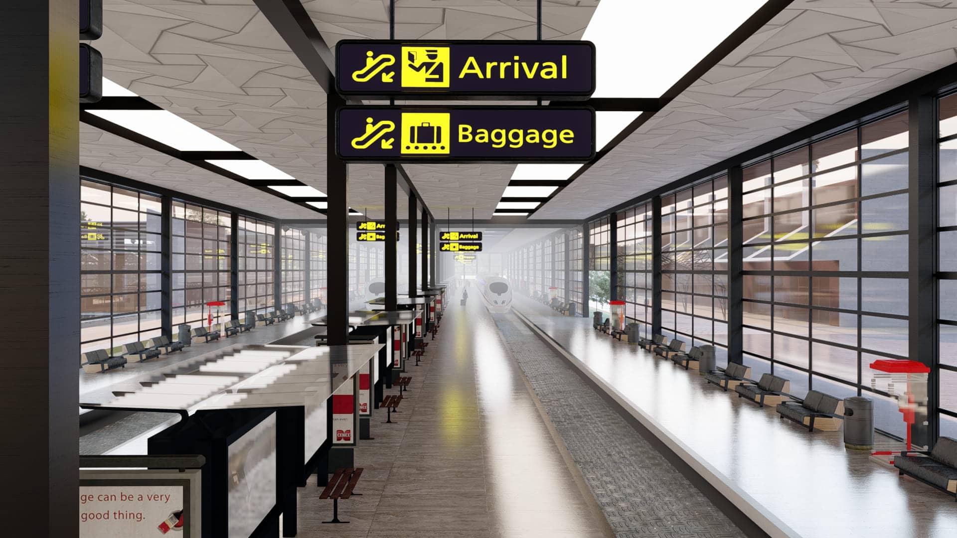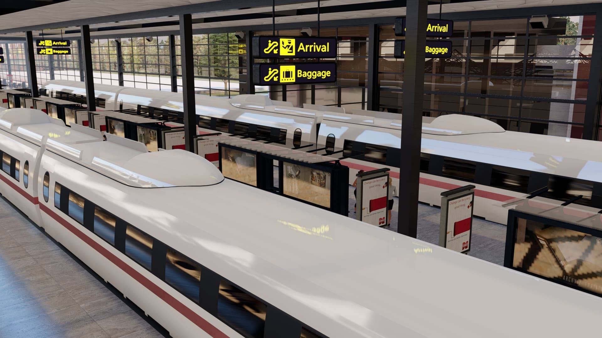 Inside, the station is equipped with multiple levels, each dedicated to different aspects of the passenger experience. The ground level hosts ticketing kiosks and digital information displays that use AI to provide real-time updates on train schedules and routes. Automated gates and facial recognition technology ensure quick and secure access to platforms.